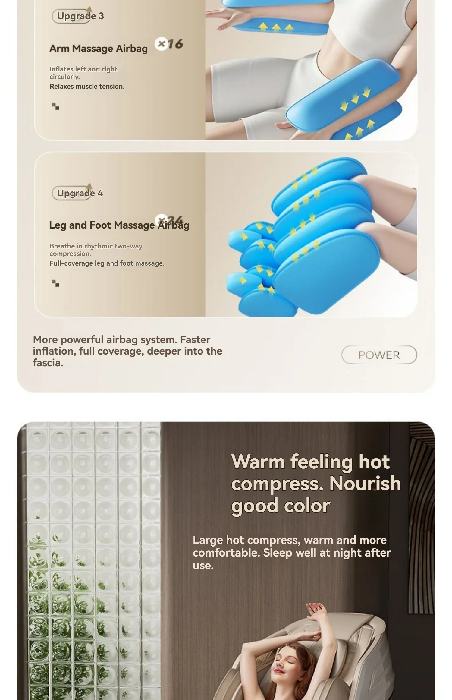 Heating Functions: Back heating, calf heating, and foot massage