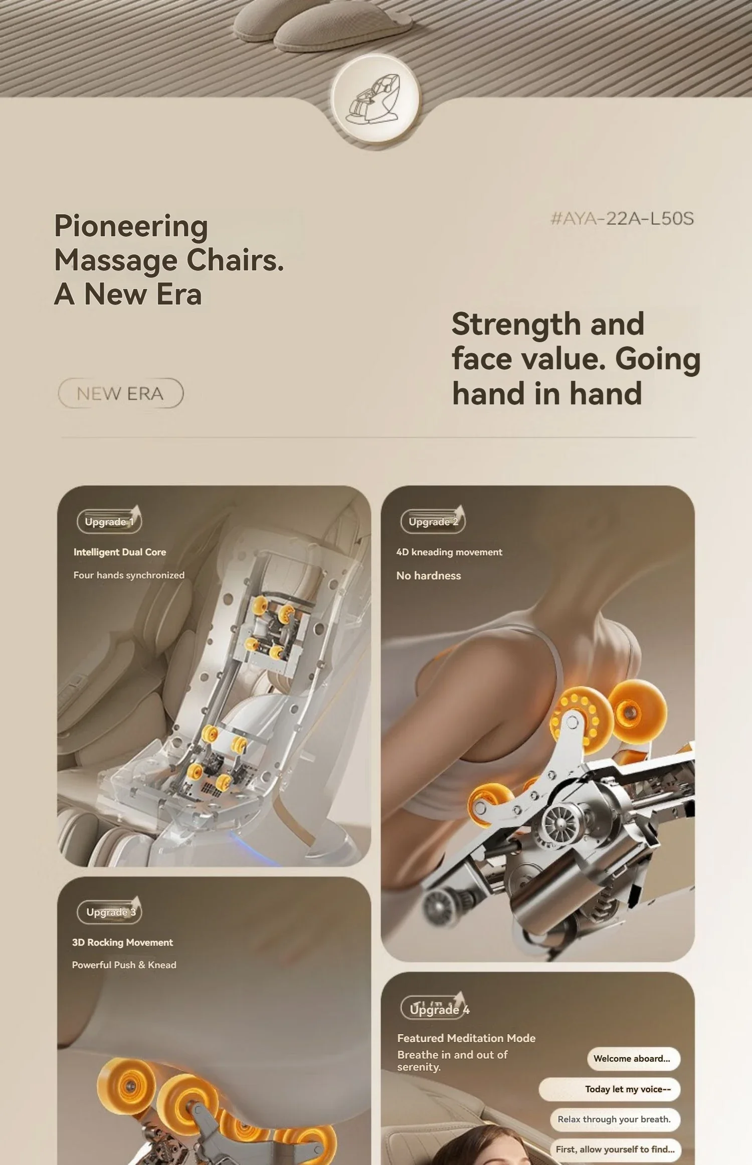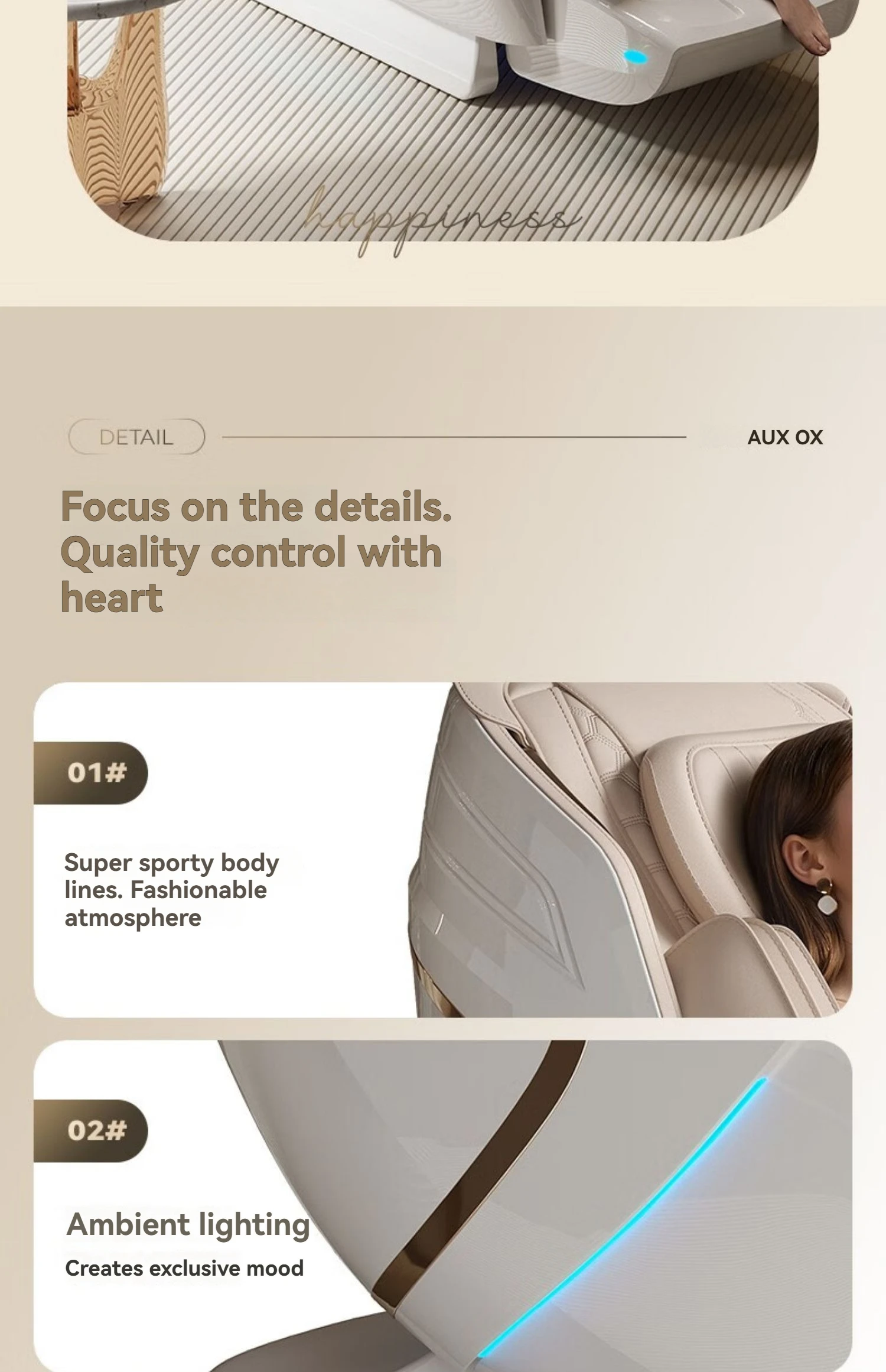 Born in 2013, AUX began with a simple mission: to transform massage therapy from a luxury into an essential wellness ritual. As factory engineers turned wellness innovators, we combined German servo motors with Japanese shiatsu techniques to create the first-generation AUX chair that won Red Dot Award in 2016.