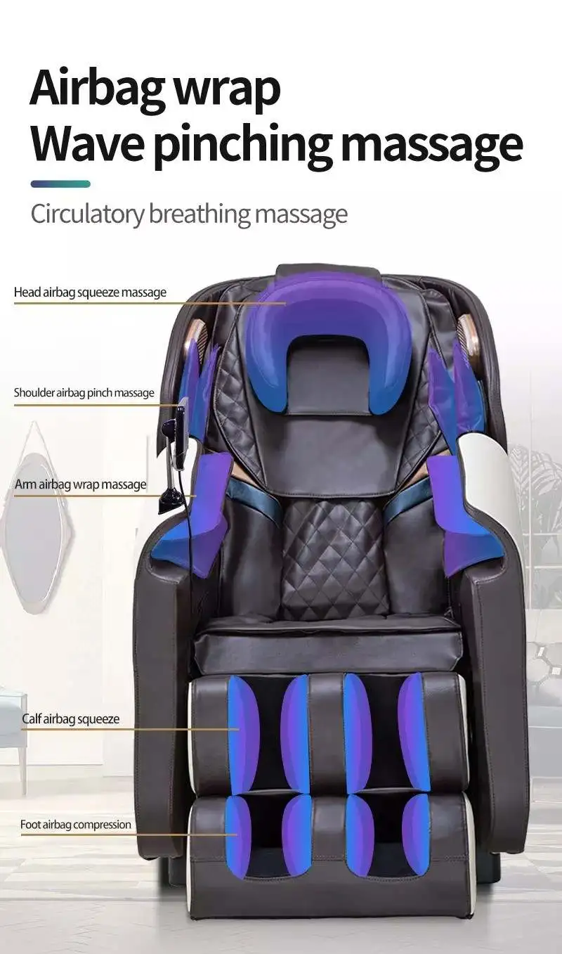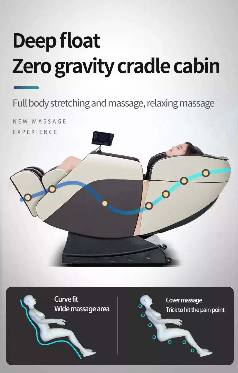The neck is equipped with four massage heads with electric height adjustment, deep massage and kneading on the spine, combined with 4D manipulator kneading, beating, walking massage on the back, the 4D manipulator is more suitable for the human spine, the massage technique is more delicate, and the massage area is larger. , Airbag squeeze for shoulder, arm, buttocks, calf, waist with heating function, foot sole with roller massage. With bluetooth music